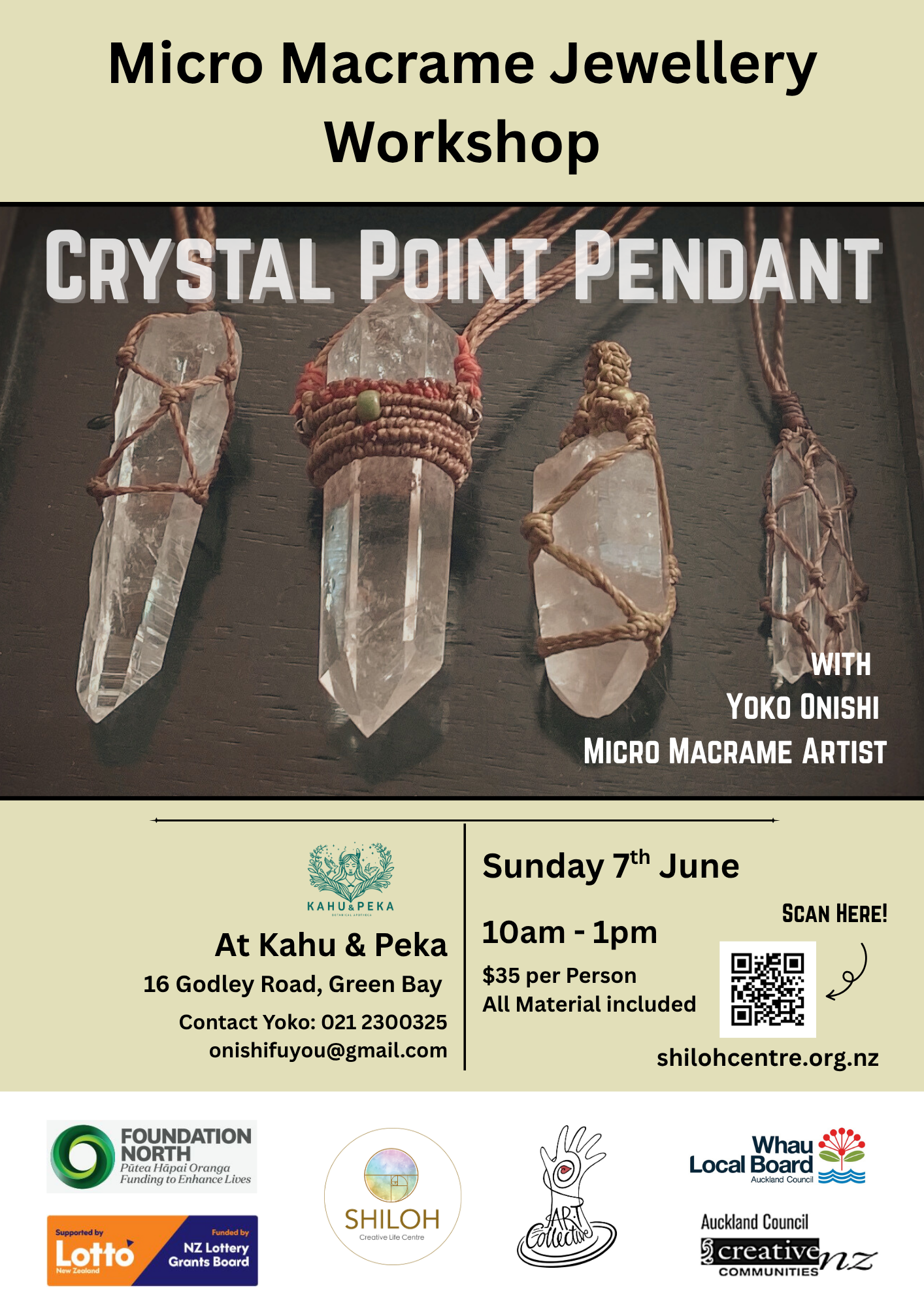 Join Yoko for a nurturing, hands-on workshop where creativity, mindfulness, and personal expression come together. In this relaxed and supportive session, participants will create a crystal point pendant using simple micro macramé techniques. No prior experience is needed—this workshop is suitable for all skill levels and offers a welcoming space to slow down, connect, and create something meaningful by hand.